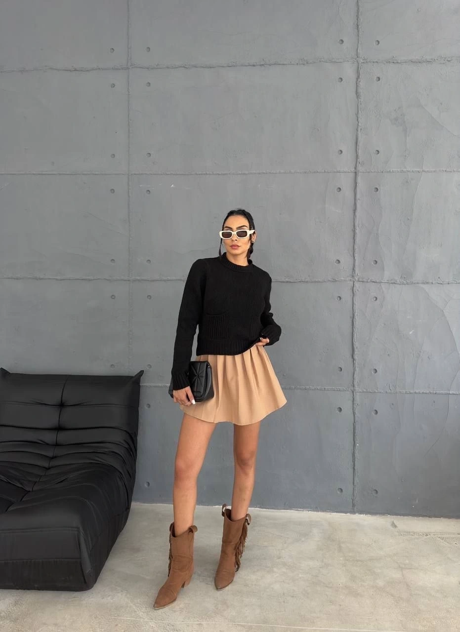 Yeni sezonda trend olan cepli triko kazak siyah rengiyle öne çıkıyor. Hem şık hem de kullanışlı olan bu kazak, gardırobunuzun vazgeçilmezi olmaya aday. İnce triko kumaşı sayesinde hafif ve rahattır.