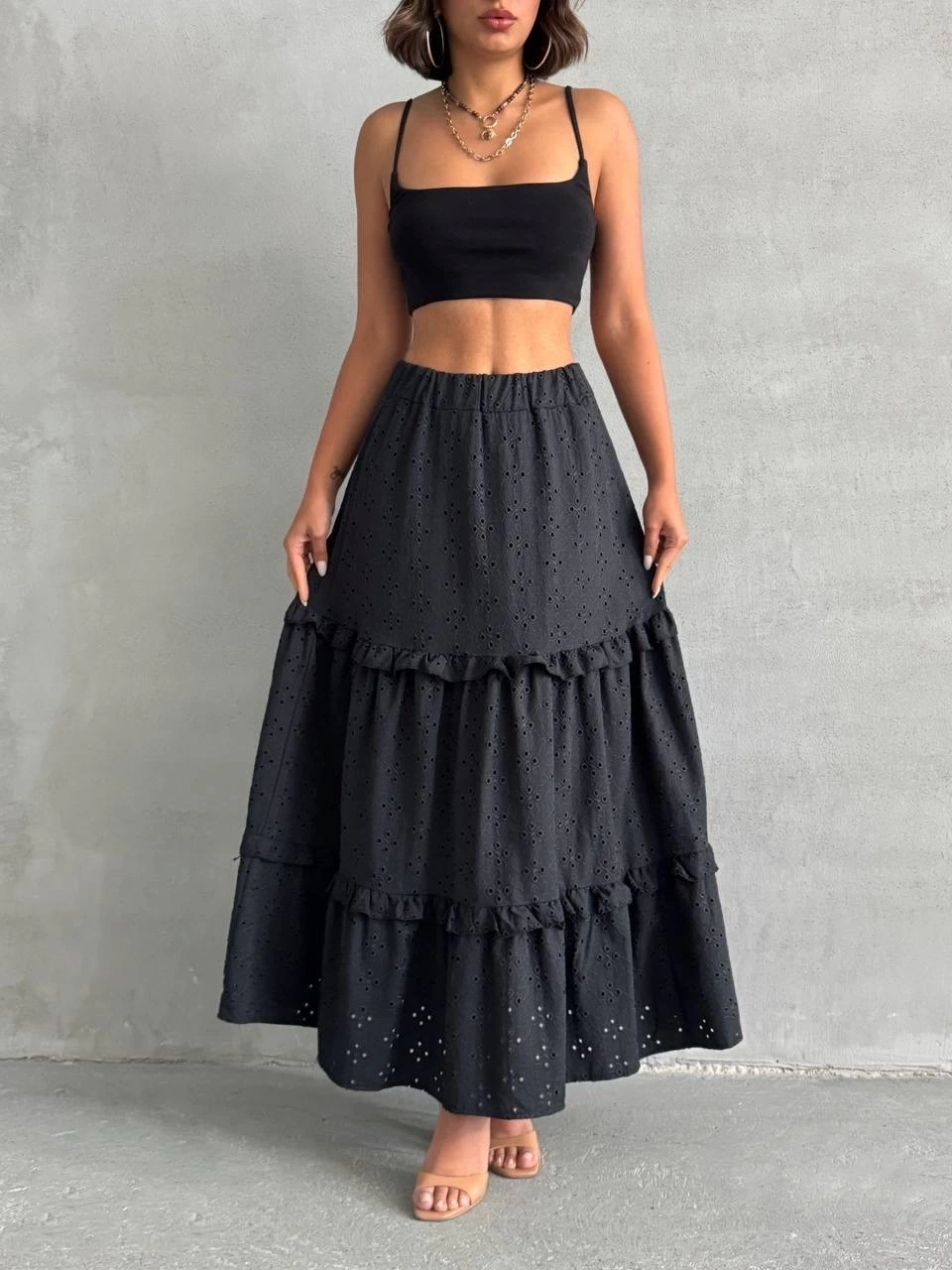 Şıklık ve tarzı bir arada sunan fırfırlı brodeli astarlı uzun etek, gardırobunuzun vazgeçilmez parçalarından olmaya aday.