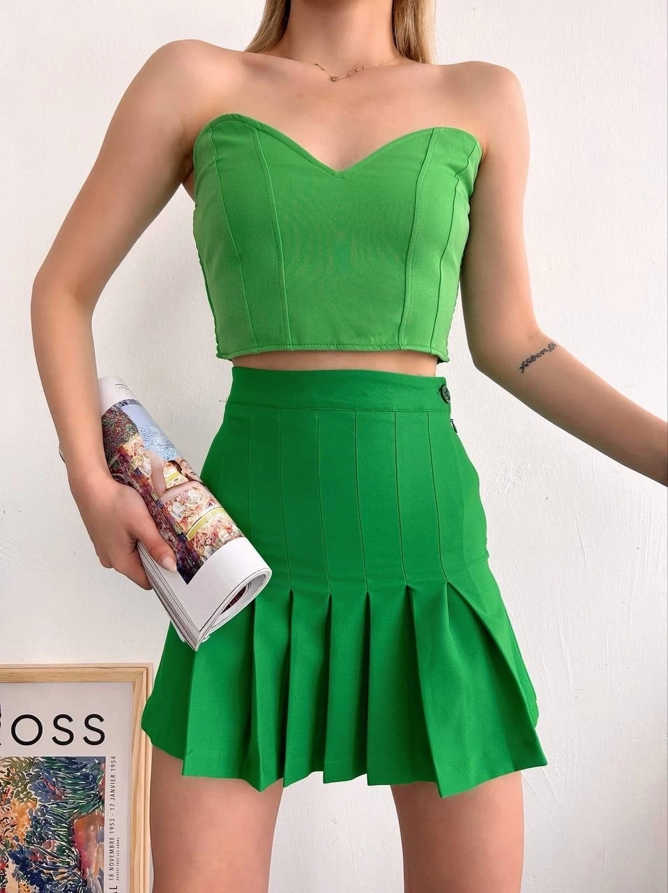 Açık yeşil rengi ile doğanın tazeliğini yansıtan bu etek, her mevsim kolaylıkla kombinlenebilir özelliğiyle dikkat çekiyor.