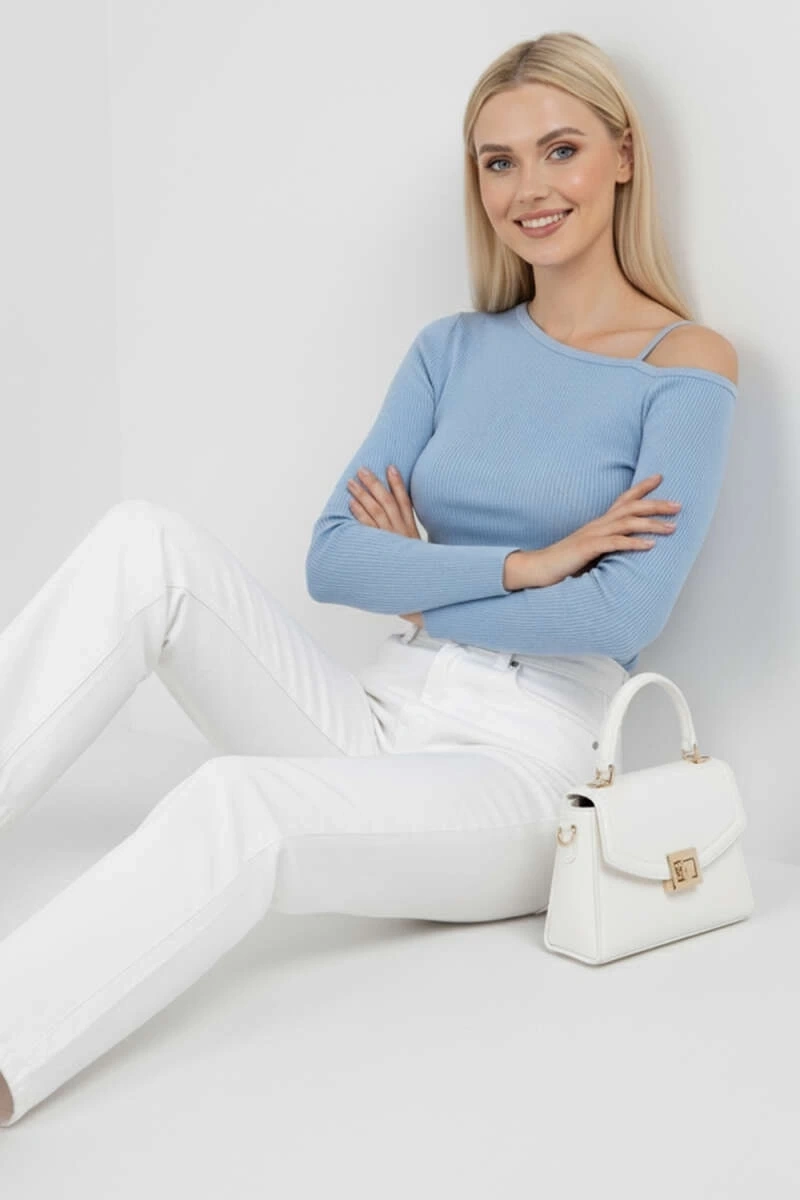 Şıklığı ve rahatlığı bir arada sunan Tek Omuz İpli Bluz mavi t4328, günlük şıklığınızı tamamlayacak bir parçadır.