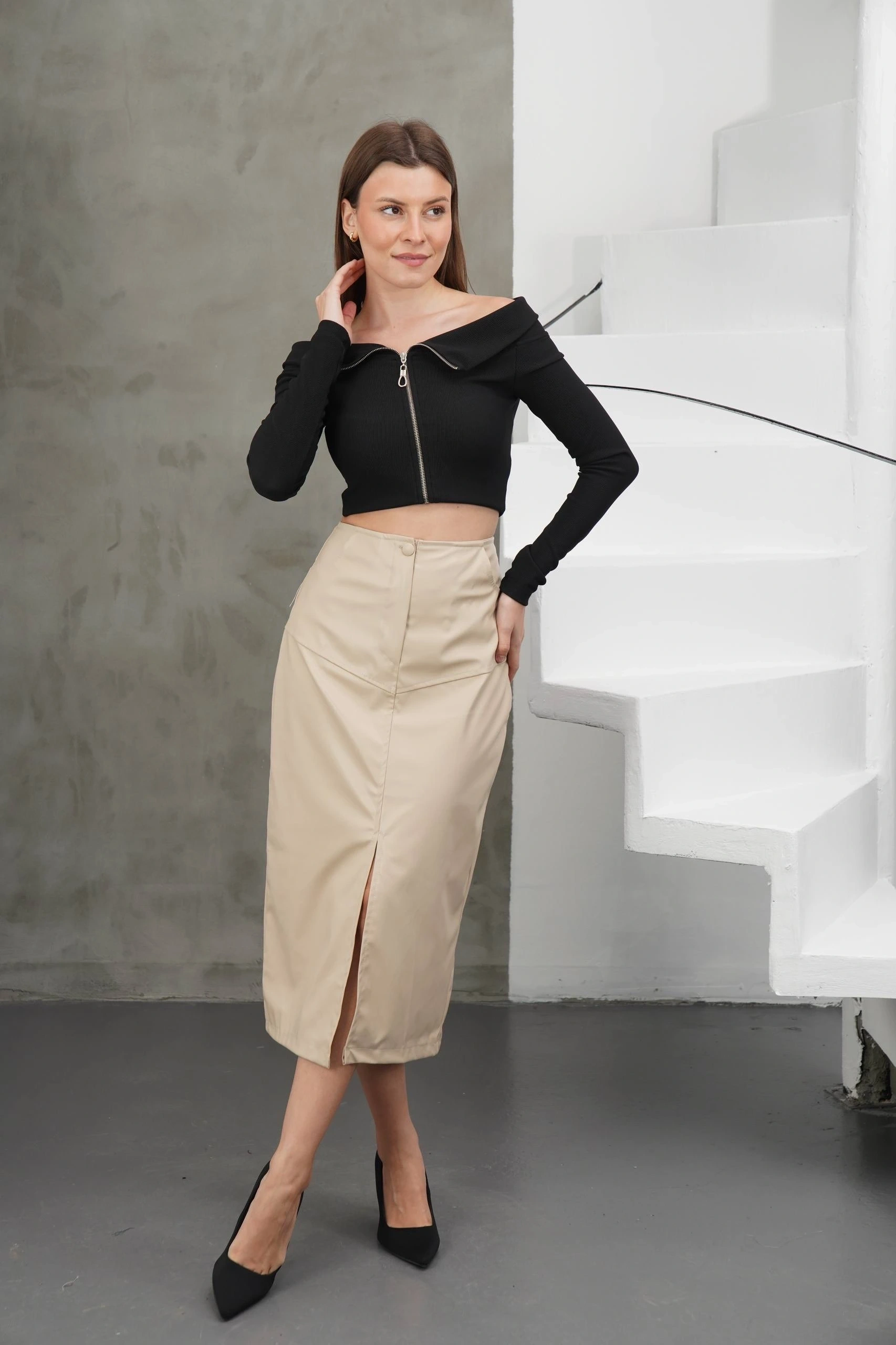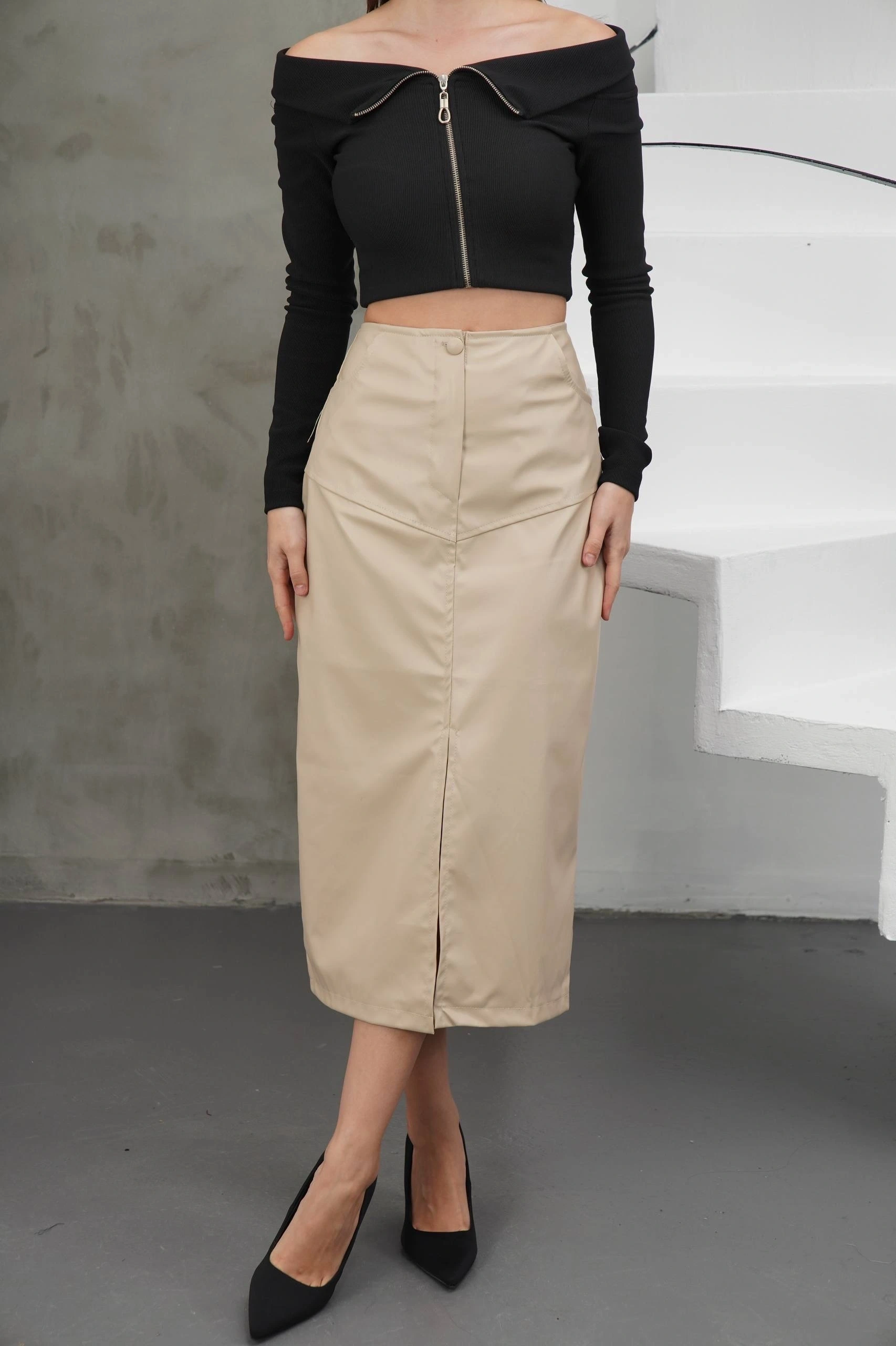 Şıklığı ve rahatlığı bir arada sunan Bej Yırtmaçlı Uzun Deri Etek, gardırobun vazgeçilmezi olmaya aday!